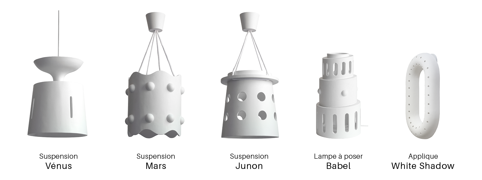 Dans cette même dynamique, la lampe à poser Babel devient le point de départ d’où s’élèvent les suspensions Mars, Vénus et Junon. Chacune d’elles représente un des niveaux de la tour symbolique, guidant les Hommes vers la lumière. L’applique White Shadow, plus discrète, se dévoile quant à elle à travers la délicatesse de ses formes et la subtilité de sa présence.